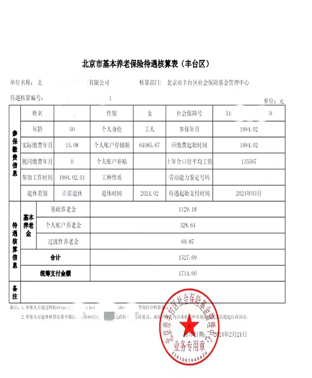 合計:1129.18+328.64+69.87=1527.69元 低于北京最低養老金,所以按1714發放。